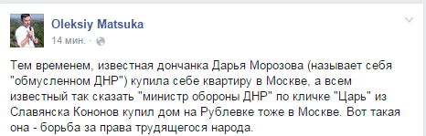 "Тем временем, известная дончанка Дарья Морозова (называет себя "обмусленном ДНР") купила себе квартиру в Москве, а всем известный так сказать "министр обороны ДНР" по кличке "Царь" из Славянска Кононов купил дом на Рублевке тоже в Москве. Вот такая она - борьба за права трудящегося народа", - написал Мацука.