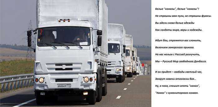 Сторонники террористической «луганской народной республики» в самом Луганске решили сочинить «оду-гимн» …грузовикам КамАЗам, которые из Российской Федерации доставляют «гуманитарные» грузы жителям оккупированных боевиками территорий.