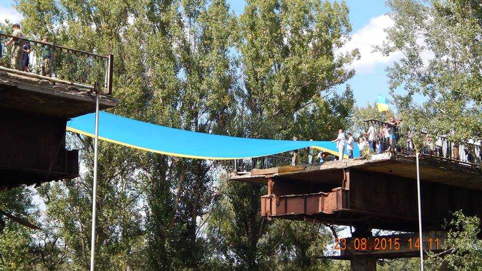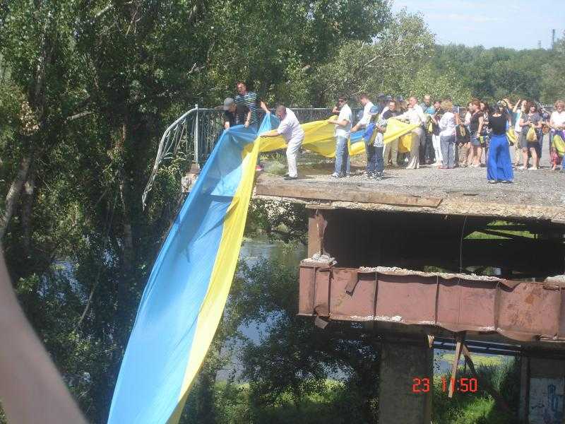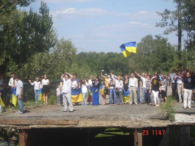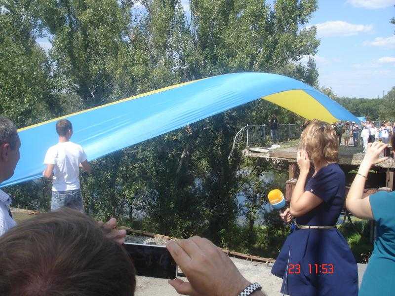 Самой впечатляющей и эмоциональной оказалась встреча жителей двух соседних городов Лисичанска и Северодонецка на мосту в районе железнодорожного вокзала. Находясь в нескольких шагах друг от друга, они не смогли обняться и пожать руки. Виной тому — разрушенный боевиками мост. Однако для настоящих патриотов нет преград, их объединил 70-метровый государственный флаг Украины, соединивший два берега.