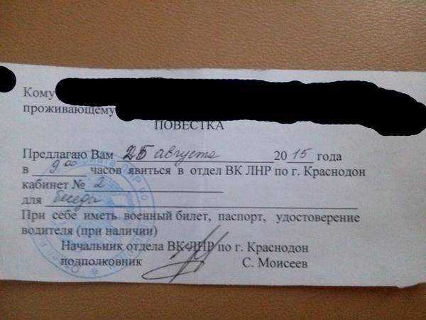 Жителям города Краснодон, который находиться на оккупированной «ЛНР» территории Луганской области начали приходить повестки для беседы в местный «военкомат».