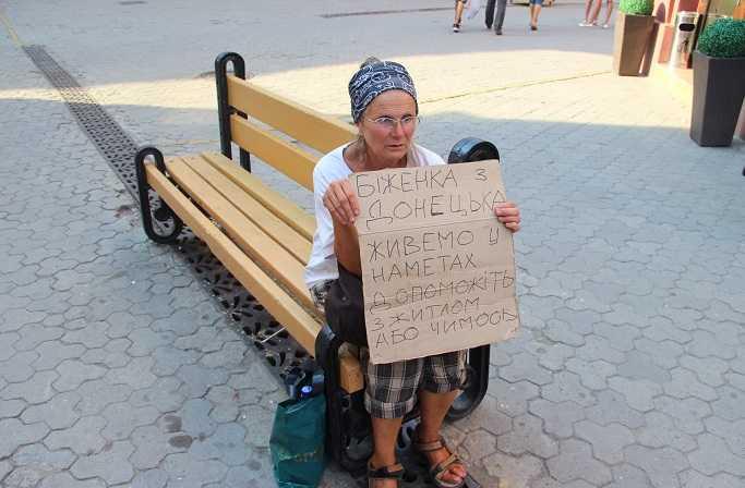 На днях в центре Ужгорода можно было увидеть худую женщину преклонных лет, которая скромно сидела на лавочке и держала картонку с надписью: «Мы - беженцы из Донецка. Живем в палатке. Помогите нам».