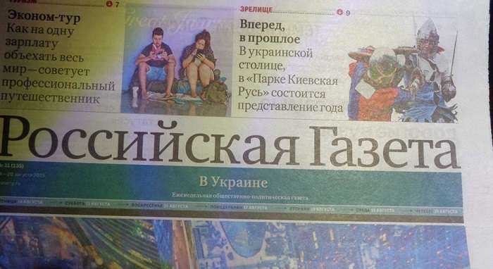 В одном из киевских супермаркетов - «Караване» - продается цветной еженедельник, который называется «Российская газета в Украине». В печатном издании нет сообщений о «хунте» или «правосеках», но информация подается таким образом, чтобы подчеркнуть общность украинского и русского народов. Газета издана в «ДНР», отпечатана в Харькове. Об этом сообщает в соцсети журналист Андрей Лаврик.