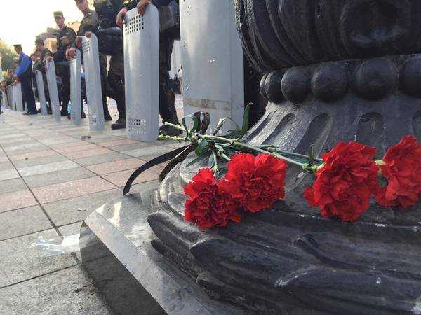 Киевляне несут цветы к зданию ВР, где смертельное ранение получил военнослужащий Нацгвардии. Об этом пишут пользователи соцсетей.