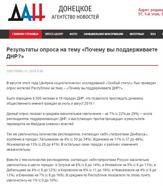 Примечательно, что инициатором опроса выступили сами местные власти. Его провел Центр социологических исследование "Особый статус". Результаты опубликовали посредством "Донецкого агентства новостей".