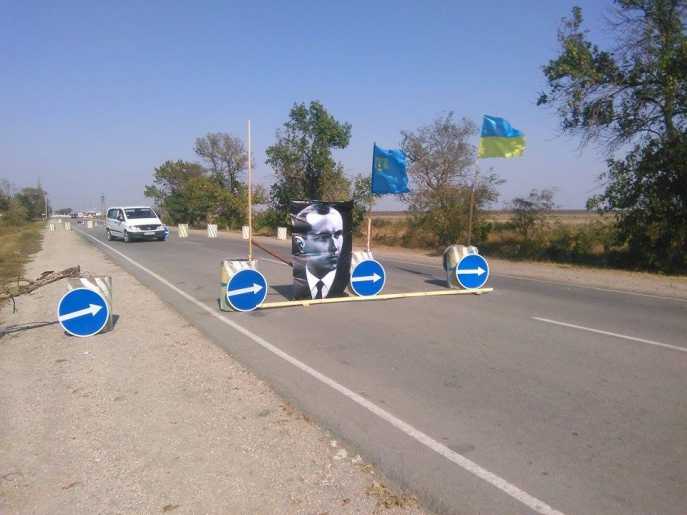 На блокпосту "Чонгар" вблизи границы с временно оккупированным РФ Крымом активисты, которые объявили продовольственную блокаду "власти" полуострова, установили портрет лидера Организации украинских националистов Степана Бандеры.
