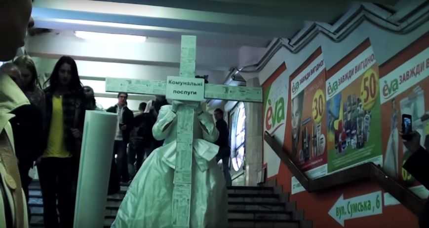 Девушка в белом платье и с закрытым черной вуалью лицом, разгуливала по харьковскому метрополитену. В руках у таинственной незнакомки был внушительных размеров крест, с надписью "Коммунальные услуги", сообщили очевидцы в соцсетях.