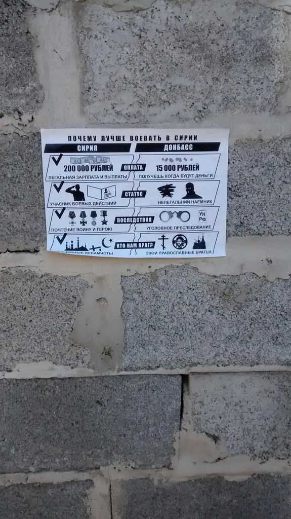 В анонимных объявлениях указывалось, что у воюющих в Сирии солдат зарплата гораздо выше, чем у донецких боевиков, кроме того, они могут рассчитывать на официальный статус участника боевых действий.