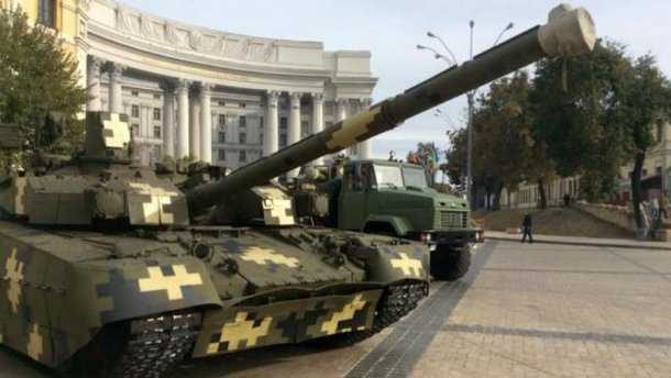 Украинские танки и БТРы стоят в центре столицы в качестве экспонатов для выставки, приуроченной ко Дню защитника Украины.