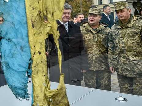 В Киев на выставку оружия, которую открывал президент Украины Петр Порошенко на Михайловской площади, привезли расстрелянный флаг из-под Иловайска.