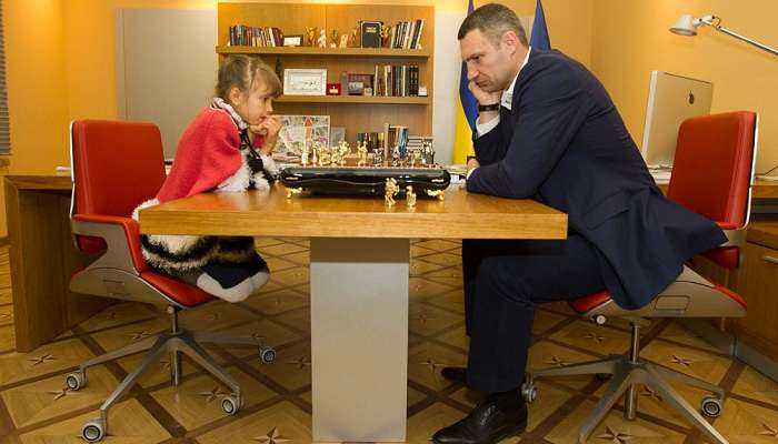 8-летняя Вероника Веремьюк одержала победу на чемпионате Европы по шахматам в своей возрастной категории. Мэр Киева Виталий Кличко встретился с ней, чтобы поздравить ее с победой. Между девочкой и спортсменом состоялся шахматный поединок – блиц-партия, в которой Вероника одержала уверенную победу.