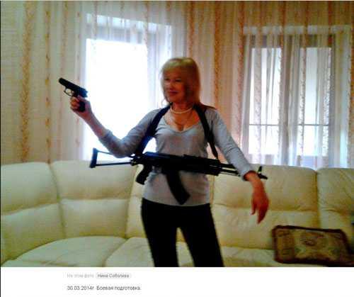Так, к примеру, эта дама позировала с автоматом. Снимок датирован 30 марта 2014 года. В этот момент Краматорск как раз объяла «русская весна» с бабаями и прочим новороссийским ширпортребом.