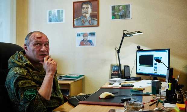 Приемный кабинет командира повстанцев Юрия "Ростова" Шевченко, украшен портретами Путина и Сталина. В этом здании бывшего советского КГБ, расположенного в промышленном городе Алчевске, члены батальона "Призрак" под командованием Шевченко все чаще высказывают недовольство шатким режимом прекращения огня в Донбассе.