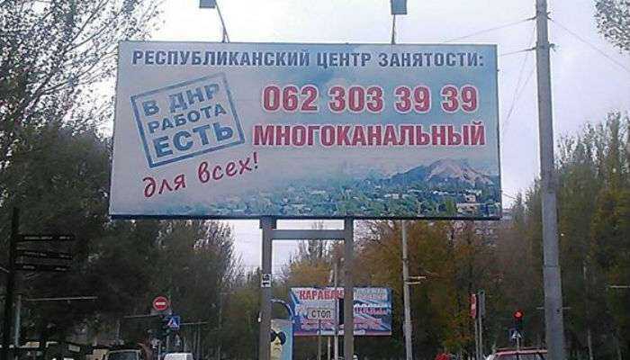 Напомним, власти «Донецкой народной республики» решила бороться с безработицей среди дончан. Правда результатов пока нет, кроме новых билбордов с надписью: «В ДНР работа есть для всех». По крайней мере такая агитка украшает город последний месяц.