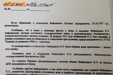 В материалах, переданных заявителем в органы прокуратуры Украины, есть официальный ответ исполняющего обязанности так называемого генерального прокурора «ДНР» Андрея Певца, в которой указано, что Евгений Файницкий арестован за «...проукраинскую, бандеровскую, националистическую позицию».