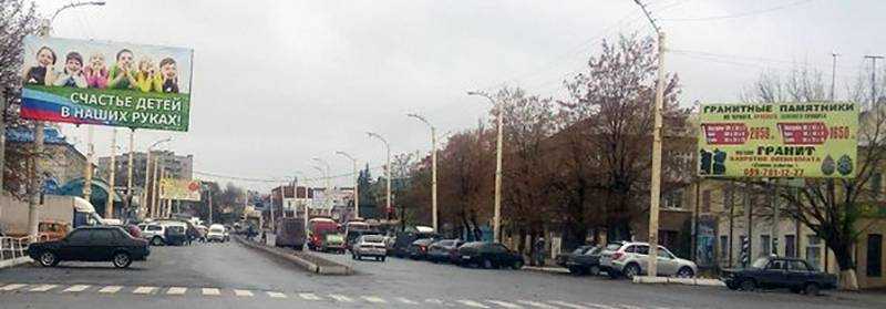 В центральной части города на разных краях пешеходного перехода размещена реклама «ЛНР» («Счастье детей в наших руках») и ритуальных услуг («Гранитные памятники»).