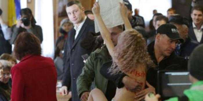 В воскресенье 15 ноября на избирательном участке в бывшем Суворовском училище в Киеве, во время голосования во втором туре выборов, Виталия Кличко с супругой встречала полуобнаженная девушка с надписью и криками «Стоп сутенер».