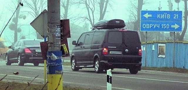 Во время поездки Яценюка в Киев специальные работники перекрывают шоссе. Сначала на дорогу выезжает Volkswagen, дальше едет Mercedes, а затем два микроавтобуса с сопровождением.