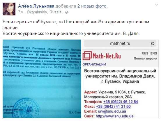 «Если верить этой бумаге, то Плотницкий живет в административном здании Восточноукраинского национального университета им. В. Даля», — сообщила журналист.