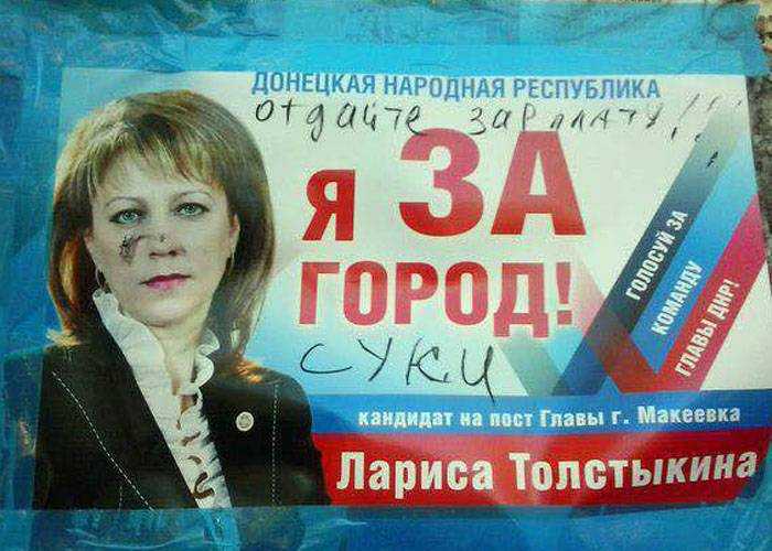 Но на билбордах видна агитация времен местных «выборов» в Макеевке - кандидат в «народные меры» Лариса Толстыкина.