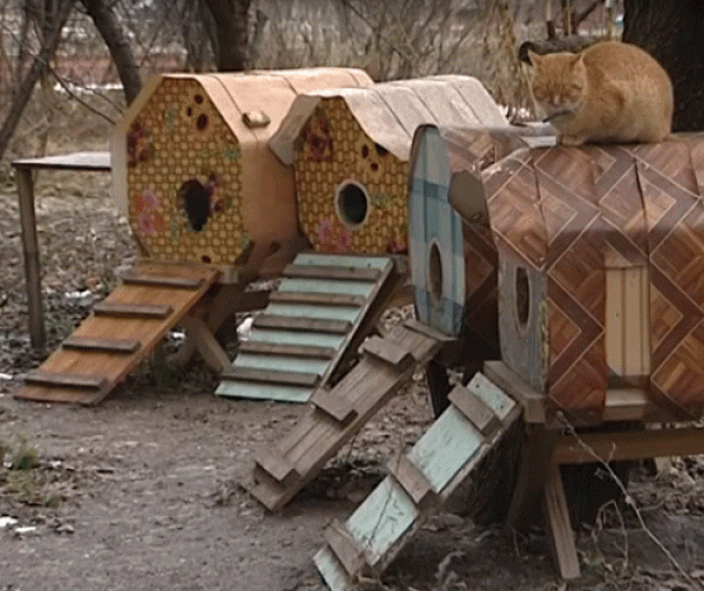 Наблюдая за брошенными кошками и котятам, он выстроил им целый «квартал» — красивые домики из подручного материала, утепленные и удобные. Эту идею позаимствовали в Перу члены его семьи.