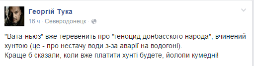Георгий Тука также прокомментировал сложившуюся ситуацию на своей странице в "Фейсбук", где осудил пророссийские СМИ, которые не прекращают говорить о "геноциде донбасского народа", который учинила "хунта".