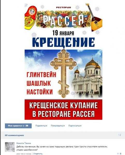 В оккупированном Донецке по-своему готовятся к празднованию Крещения Господнего. К примеру ресторан "Рассея" приготовил свою "культурную" программу.