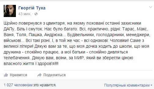 "Только что вернулся с кладбища, на котором похоронены последние защитники ДАПа. Боль и грусть. Нас было много. Все, практически, родные: Тарас, Макс, Ваня, Толя, Пашка, Андрюха... Строители, хозяйственники, менеджеры, военные... Все такие разные. И, в то же время - все одинаковые: Мужчины! Именно с большой буквы! Спасибо вам за то, что моя дочь ходит в школу, что моя жена спокойно работает, а мои родители - спокойно смотрят телевидение. Спасибо вам, воины, за МИР, который вы сохранили ценой собственной жизни и здоровья!!!", - написал он.