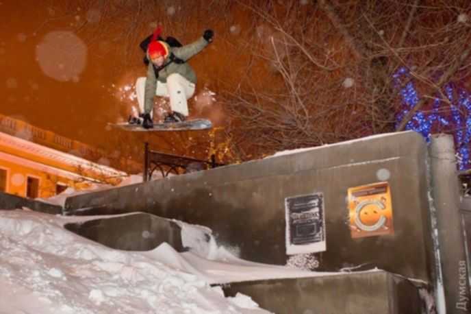 Зато экстремалы отрываются по полной программе! Из заснеженной Потемкинской лестницы устроили трассу для слалома, по которой пытаются съехать смельчаки-сноубордисты. Но снега там – не как в Буковеле, поэтому порой из под досок летят искры от гранитных ступеней. Проехать более 3 пролетов лестницы мало кому удается, поэтому основная масса сноубордистов перебралась на склоны Стамбульского парка под Приморским бульваром.