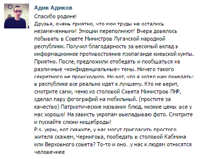 На своей странице в социальной сети Facebook российско-террористический пропагандист Адик Адиков похвастался фотографиями из столовой "Совета министров" "ЛНР".