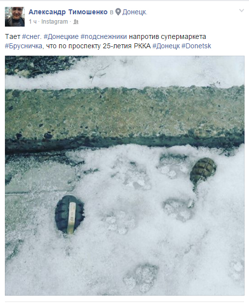 "Тает #снег. #Донецкие #подснежники напротив супермаркета #Брусничка, что по проспекту 25-летия РККА #Донецк #Donetsk", - написал редактор газеты "Вести" Александр Тимошенко в своем Instagram.