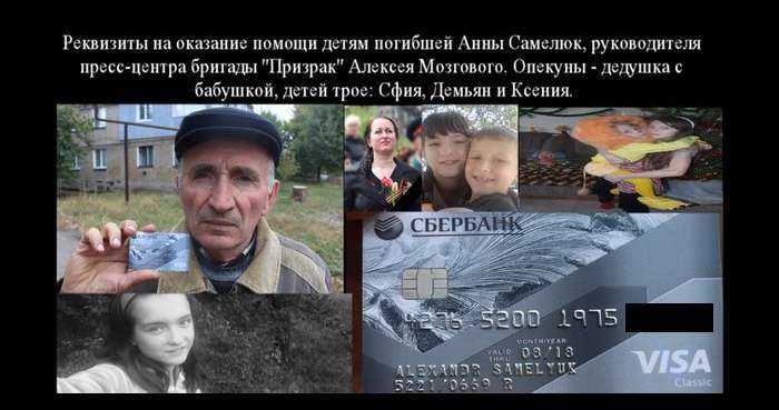 «Люди добрые, откликнитесь, пожалуйста! Прошел почти год со дня гибели легендарного комбрига Алексея Мозгового... В то роковое время с Алексеем Мозговым погиб и его пресс-секретарь Анна Асеева (Самелюк)... Беда в том, что у Анны Асеевой остались сиротами трое детей. Опекают их дедушка с бабушкой. Только они детей и «тянут» - пенсии и зарплаты мизерные, подрабатывают где только могут», - призывают сторонники «ДНР» и «ЛНР» весь «русский мир» помочь детям погибшей террористки.