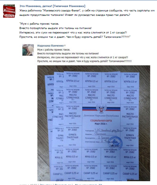 Жительница оккупированной Макеевки на своей странице в социальной сети написала, что ее мужу на заводе "Макеевский завод "Факел" часть зарплаты выдали талонами на питание.