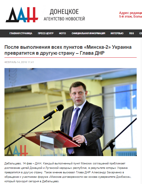 "Мы вынудили Украину к переговорам, и Минские соглашения, подписанные год назад, стали показателем нашей силы и нашей решимости стоять до победного конца. "Минск-2" это большое поражение Украины. Каждый пункт минских соглашений это шаг к нашей безоговорочной победе. По итогу выполнения всего комплекса мер по урегулированию конфликта на Донбассе Украина превратится в другую страну", - заявил боевик Пушилин.