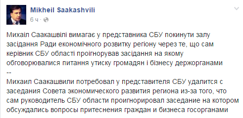 Представитель СБУ, присутствовавший на совещании вместо своего руководителя попытался заговорить с Михаилом Саакашвили, но председатель Одесской ОГА оборвал его слова и потребовал покинуть помещение. Как объяснил Саакашвили, он не потерпит, чтобы чиновники игнорировали подобные заседания, на которых обговариваются вопросы ущемления прав граждан и бизнеса государственными органами.