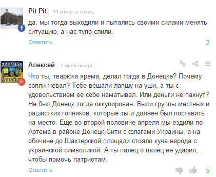 "Что ты, тварюка Ярема, делал тогда в Донецке? Почему сопли жевал?", Тебе вешали лапшу на уши, а ты с удовольствием ее себе наматывал. Или деньги не пахнут? Не был Донецк тогда оккупирован. Были группы местных и рашистких гопников, которые ты и должен был поставить на место. Еще во второй половине апреля мы ездили по Артема в районе Донецк-Сити с флагами Украины, а на обочине до Шахтерской площади стояла куча народа с украинской символикой. А ты палец о палец не ударил, чтобы помочь патриотам, - задал вопрос бывшему главе Гепрокуратуры Украины дончанин Алексей.