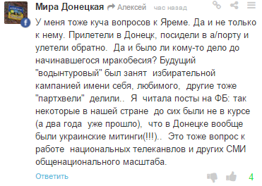 У меня тоже куча вопросов к Яреме. Да и не только к нему. Прилетели в Донецк, посидели в а/порту и улетели обратно. Да и было ли кому-то дело до начинавшегося мракобесия? Будущий "водынтуровый" был занят избирательной кампанией имени себя, любимого, другие тоже "партхвели" делили.. Я читала посты на ФБ: так некоторые в нашей стране до сих были не в курсе (а два года уже прошло), что в Донецке вообще были украинские митинги(!!!).. Это тоже вопрос к работе национальных телеканалов и других СМИ общенационального масштаба".