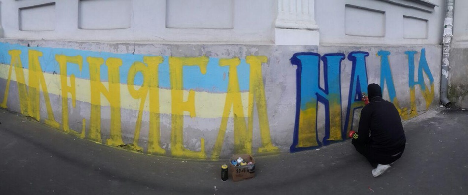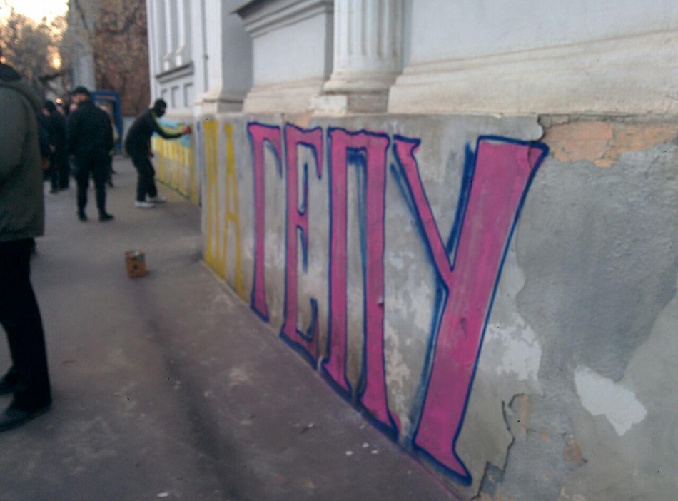 Акция продолжалась не более получаса. Пока несколько человек расписывали стену, другие скандировали патриотические речевки и стихи, посвященные Савченко.