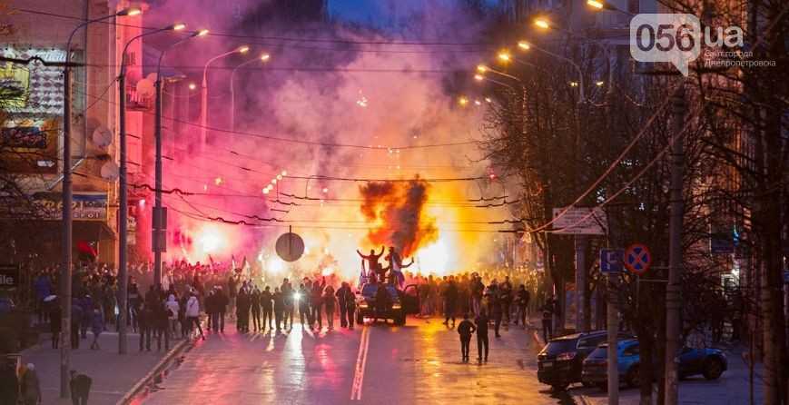 Собрались фанаты "Днепра" и "Шахтера" в центре города на площади Героев Майдана и дружна прошлись до "Днепр-Арены".