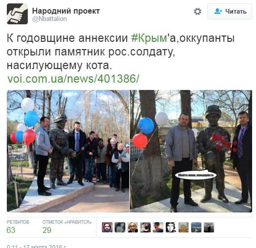 "К годовщине аннексии Крыма оккупанты открыли памятник российскому солдату, насилующему кота", - саркастично отметил пользователь Народный проект.