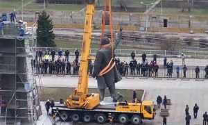Памятник идолу коммунистов Владимиру Ильичу Ленину удалось снять с постамента в Запорожье спустя 30 часов напряженной работы.