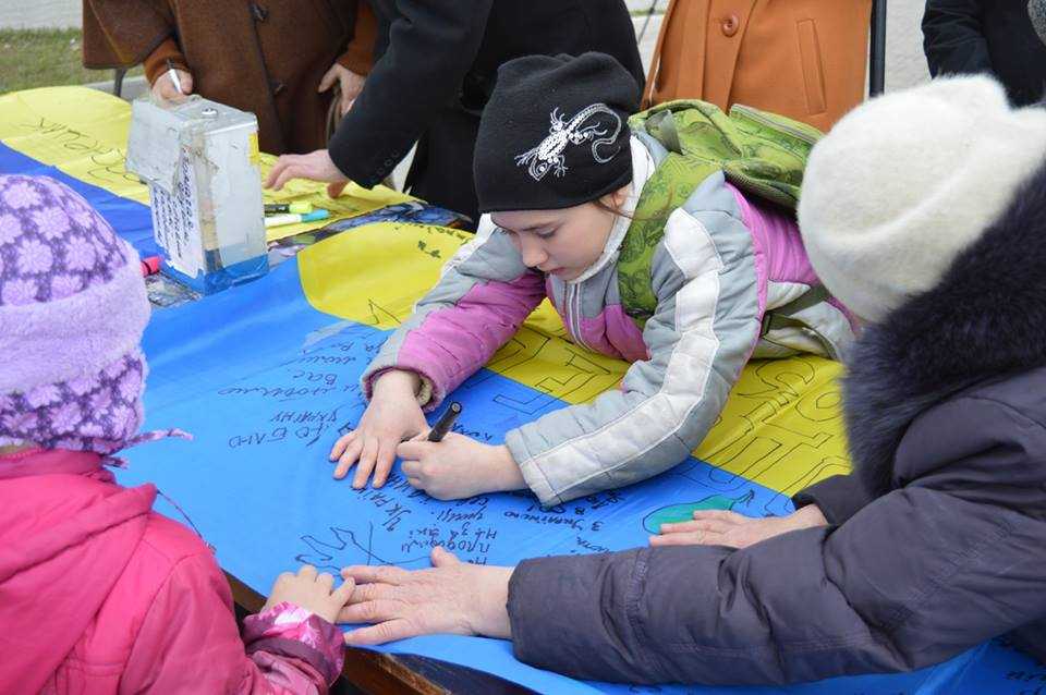 Акция собрала почти сотню неравнодушных луганчан, которые вышли на площадь, чтобы написать теплые отзывы и пожелания на флагах.