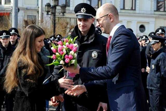 Отметим, что влюбленных тут же поздравил присутствующий на присяге новых патрульных глава украинского правительства Арсений Яценюк, вручив новоявленной невесте букет цветов.