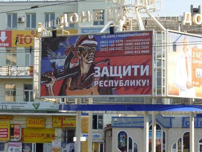 Город завешан рекламными щитами с идиотскими "цитатами" (откуда?) Александра Захарченко формата "Народ Донбасса - народ-труженик, народ-творец, народ-воин". Много биллбордов "Спасибо, Россия", но к россиянам отношение стало куда прохладнее.