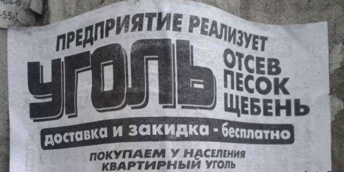 Торез «тонет» в объявлениях о продаже угля в ведрах, мешках, машинами - с занесением его во двор, гарантированным качеством и скидками для пенсионеров. Кроме самого угля, в объявлениях предлагают купить и средства производства для добычи угля в копанках. На тяжелый труд шахтера призывают многочисленные объявления, но попадания на эту тяжелую работу не гарантирует оплаты и обогащения, а вот уродство или даже смерть, возможны.