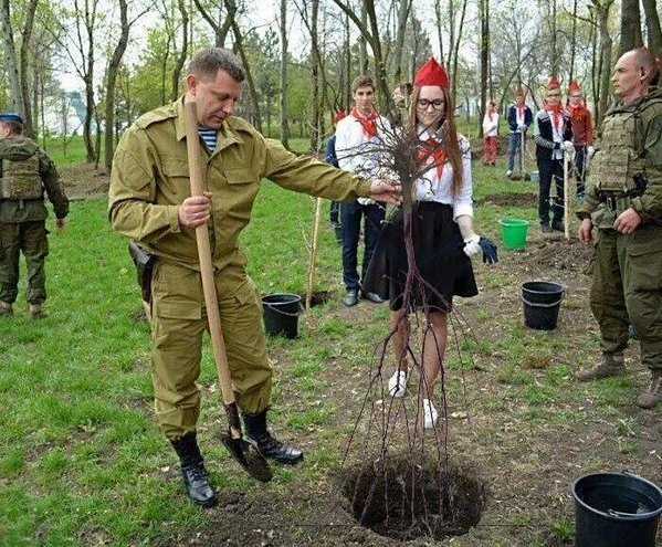 В сети продолжают появляться фото с главой так называемой “ДНР” Александром Захарченко, который вместе с новоявленными пионерами сажал деревья в Донецке. Новым хитом стал кадр, на котором Захарченко пытается посадить саженец корнями вверх.