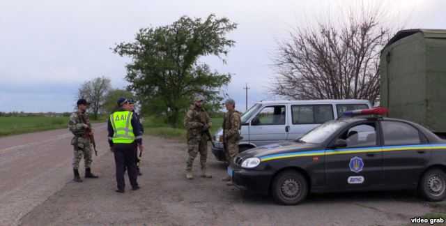 При въезде в Геническ Херсонской области украинские силовики выставили блокпост для осмотра транспорта и проверки документов. На блокпосту дежурят сотрудники полиции. Находятся также вооруженные бойцы батальона «Херсон» и полка Национальной гвардии Украины «Азов».
