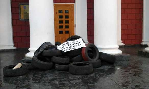 "Сейчас все входы в одесскую мэрию заблокированы участниками акции против руководства города. Главный вход в мэрию забаррикадировали мусорными баками, шинами и забором.