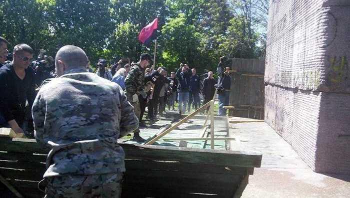 Парни, вооруженные молотами, уже снесли строительный забор вокруг монумента. После этого они начали устанавливать строительные леса. Они нужны для того, чтобы снести памятник. Неподалеку за беспорядком спокойно наблюдают сотрудники Национальной полиции. В инцидент с монументом правоохранители не вмешиваются.