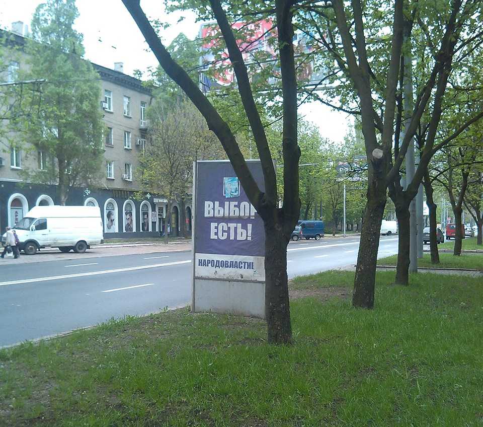 Несмотря на то, что так называемые власти «ДНР» проводят тотальный запрет на украинскую политическую рекламу и СМИ на оккупированной территории, ситилайт с рекламой организации кума Путина украинского политика Виктора Медведчука тронуть не решились. Только заклеили название организации «Украинский Выбор».