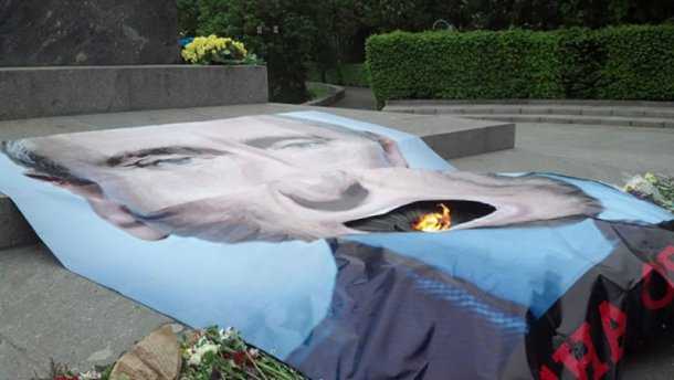 В канун Дня победы в столице Украины появилась провокационная инсталляция. Вечный огонь у Могилы Неизвестному солдату в Киеве накрыли плакатом с фотографией российского президента Владимира Путина.